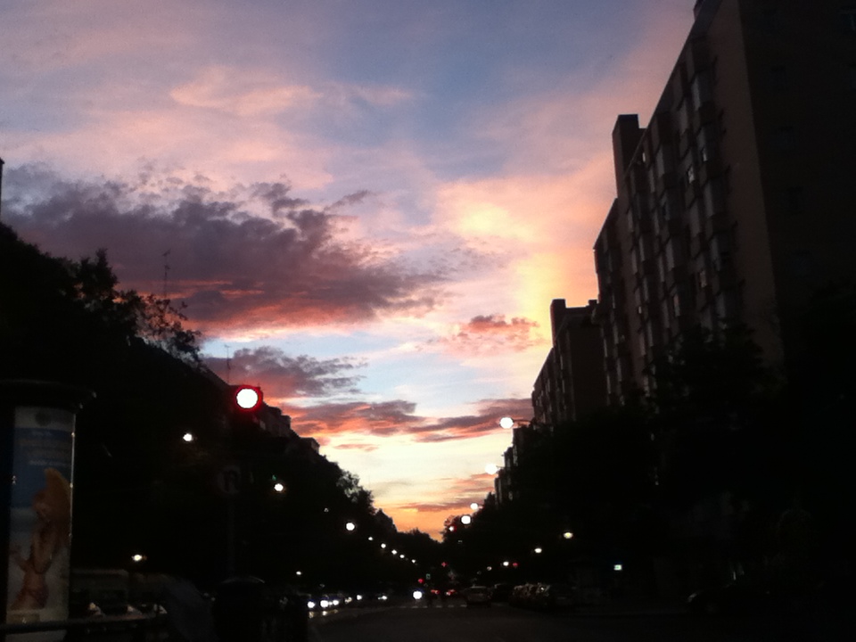 Subí al coche y me alejé de allí sin ceremonial y sin atardecer. Otro día. Recogí a mis pequeños, y con ellos en el coche, una hora más tarde, en el paseo en el que está una de las casas donde habito de modo itinerante, vino a buscarme el sol al que hacía un rato había conjurado. Ese mismo que normalmente actúa discreto, saliendo por el este, escondiéndose por el oeste, iluminando cuando toca, y enrojeciendo la línea del horizonte. Vino, y vino para sacarme poderoso de mi mirada al frente, para impedir que continuara con semáforos y distancias de seguridad, vino para imponérseme, para obligarme a mirar a lo alto. A demostrar lo inmensa que puede llegar a ser una pequeña y lejana estrella cuando se lo propone, y lo pequeños que nos deja al resto de los mortales. A demostrar que es bello el día en que se propone serlo y que no importa el decorado, que no necesita un Templo, no necesita nada, nada más que a sí mismo para hacerme levantar los ojos, para obligarme a mirarlo, a mirarlo hasta hacer daño, y qué me importa si me duele, hasta conmoverme y caer de rodillas ante su absoluto furioso e inmenso.