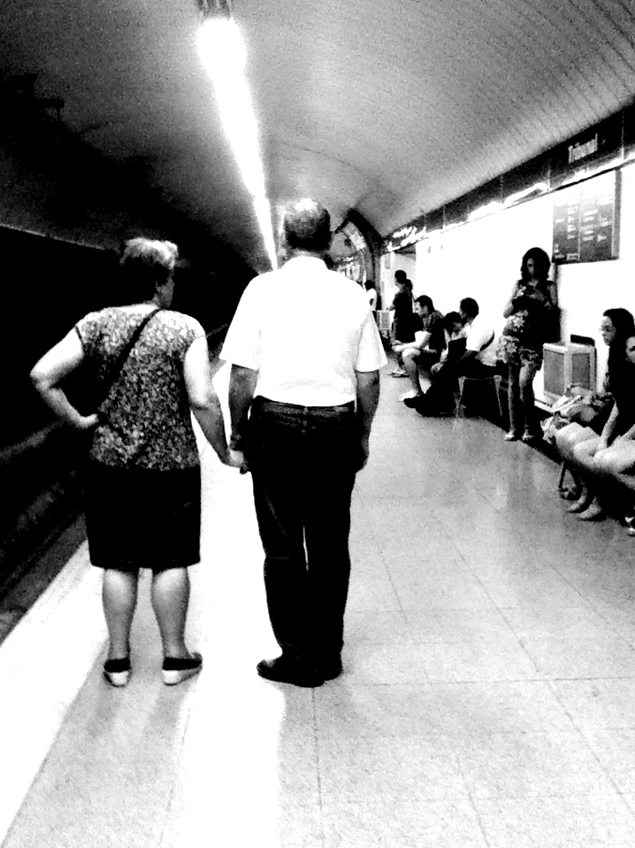 Llego a Sol en un vagón medio vacío, y me resulta un tanto decepcionante. Pensaba que se iba a repetir el espachurramiento, y el canto de sirenas, pero nunca se repite nada. Los momentos son siempre únicos. Está todo tan desangelado en relaicón a la idea de una estación tomada por el acontecimiento revolucionario del símbolo minero que tengo que asegurarme, leyendo de nuevo el cartel, que estoy en la estación en que debo estar. No hay duda. Es Sol. Me voy al andén de enfrente, por si la revolución llega desde el sentido opuesto. Y no. ¿Qué ha ocurrido? Quizá debería ir a la superficie. Miro el reloj, pasan ya de las nueve y veinte. A las nueve y media es mi hora de poder preguntar por los cachorros, tengo que comprar pan, terminar de recoger en casa, llevo casi dos horas vagabundeando por túneles subterráneos y me he habituado al subsuelo… No sé. Sí. Son excusas. Pero me sirven. Me monto en el siguiente tren. Hago trasbordo en Tribunal. Aunque me fijo no vuelvo a ver un solo minero. Pero veo en el andén una pareja de señores mayores que mientras esperan lo caminan a paso suave de una punta a otra, tomados de la mano. No se sueltan ni cuando llega el metro y han de subir. Y los fotografío.